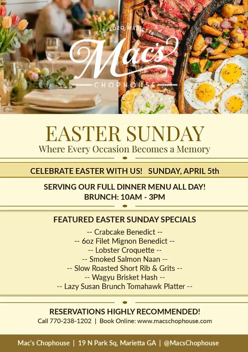 🍽️ Easter at Mac's Chophouse — 19 N. Park Square, Marietta | Brunch & dinner | Menu prices; reservations strongly recommended | More: Event info