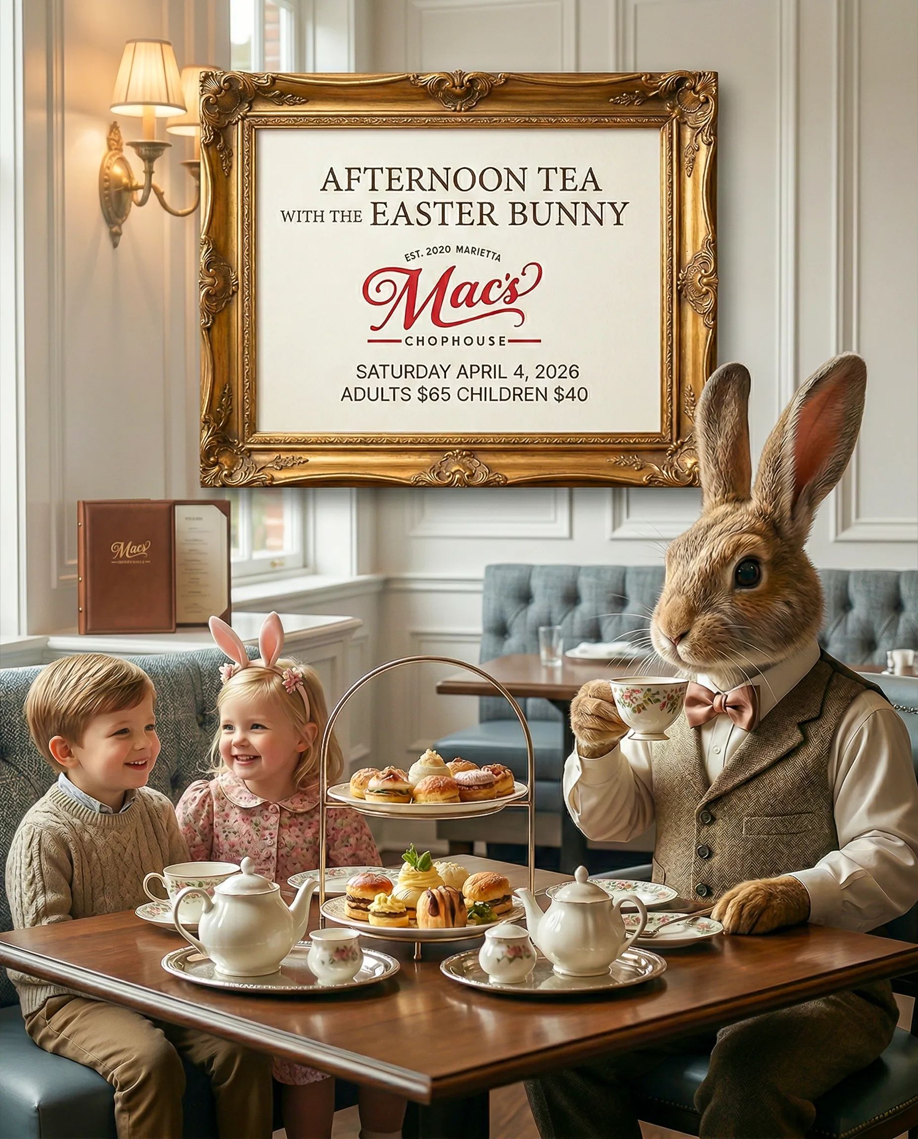 🍽️ Afternoon Tea with the Easter Bunny — Mac's Chophouse, 19 N. Park Square, Marietta | Check website for time | Check website for pricing | More: Event info