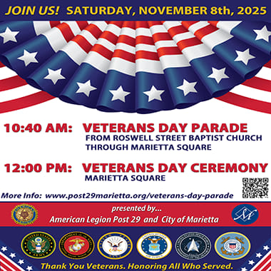 The City of Marietta’s 2025 Veterans Day Parade steps off at 10:40 am on Saturday, November 8th at Roswell Street Baptist Church.